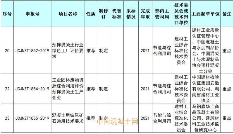 近日,工信部公开征集对72项行业标准计划项目的意见,其中包含多项混凝土行业绿色制造标准项目。工信部对申请立项的72项行业标准计划项目予以公示,截止日期为2019年9月1日。如对拟立项标准项目有不同意见,请在公示期间填写《标准立项反馈意见表》并反馈至工业和信息化部科技司,电子邮件发送至KJBZ@miit.gov.cn(邮件主题注明:标准立项公示反馈)。