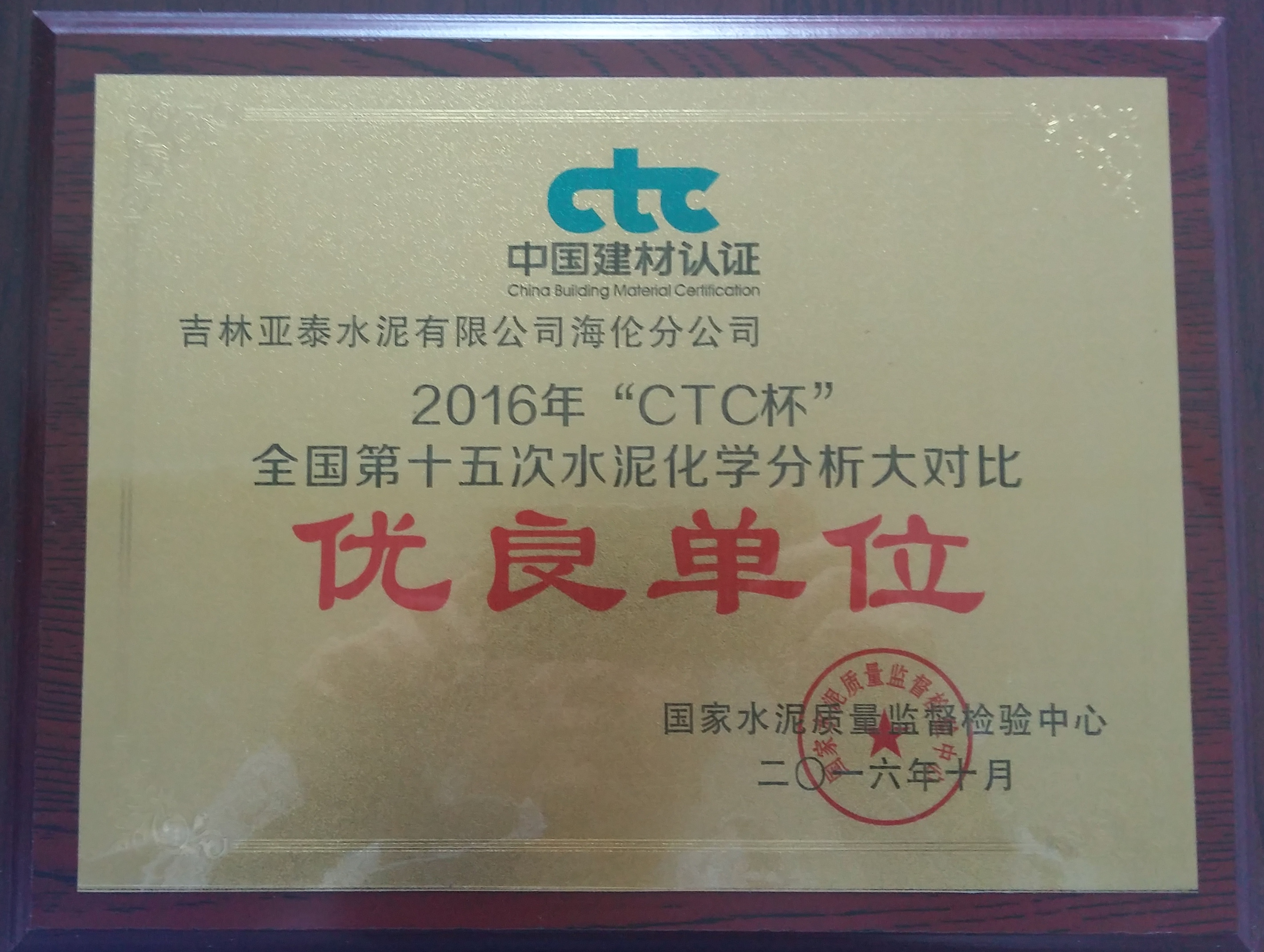 2016年“CTC杯”全国第十五次水泥化学分析大对比优良单位