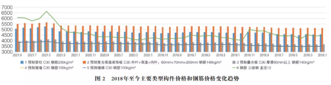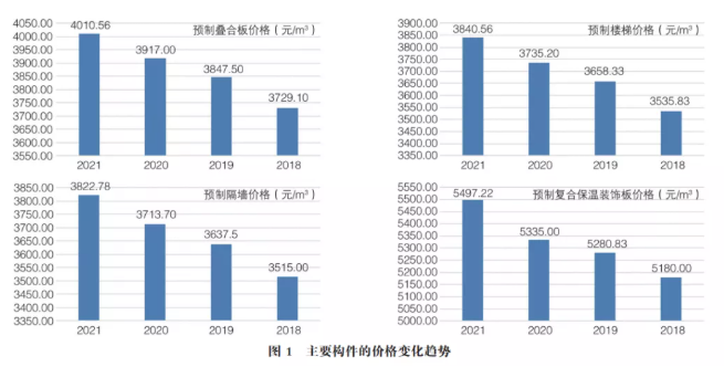 PC构件市场价格也随着政策、市场波动。有一个被市场接受、推广应用逐渐普遍的过程。笔者整理了北京工程造价信息2018年度至今主要类型PC构件含税价格的数据,预制叠合楼板2018年均价为3729.17元/m3,2018年底价格达到3810元。2019年均价为3847.5元/m3,2020年均价为3917元/m3,2021年1~9月份均价为4010.56元/m3。主要构件的价格变化趋势如图1所示。