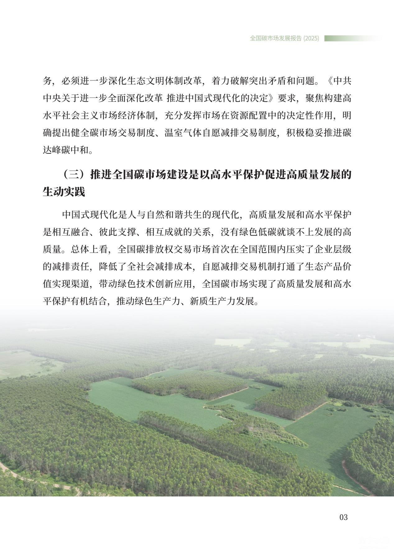 《全国碳市场发展报告(2025)》系统总结了全国碳排放权交易市场和全国温室气体自愿减排交易市场的最新建设进展,全方位展示了市场建设运行成效,展望了全国碳市场未来发展方向,是继2024年《全国碳市场发展报告(2024)》之后,生态环境部发布的全国碳市场最新进展情况报告。
