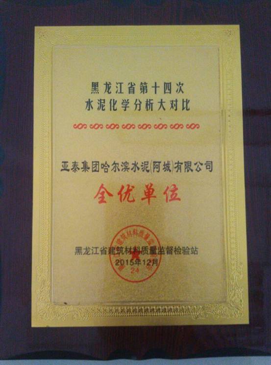 亚泰集团哈尔滨水泥(阿城)有限公司在黑龙江省第十四次水泥化学分析大对比、第二十一次水泥物理检验大对比活动中获得“全优单位”荣誉称号