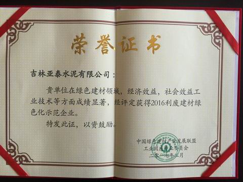 吉林亚泰水泥有限公司荣获2016利废建材绿色化示范企业荣誉称号