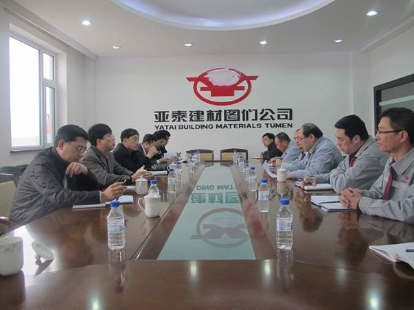 2014年4月3日上午,延边州州委群众路线教育实践活动第二督导组组长朱哲洙、图们市委书记金基德等领导到亚泰建材图们公司调研指导工作,企业总经理周芳菁接待了朱组长、金书记一行。