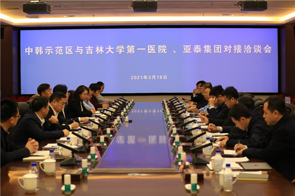 随后,宋总与示范区领导、吉大一院领导一同前往中韩示范区管委会就重离子医院合作事宜进行了对接洽谈,就成立专班、签订框架协议、项目开工前期筹备达成共识。长春市委常委、中韩示范区党工委书记高玉龙主持洽谈会。