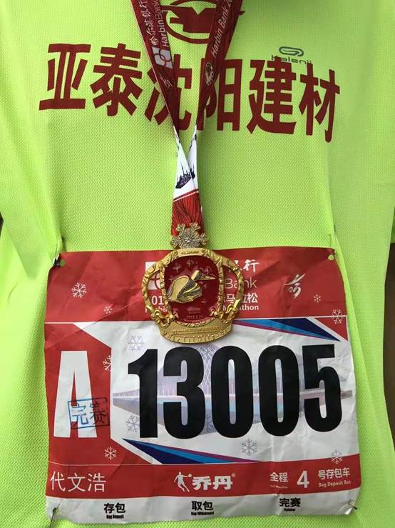 没有全马经验的我还未跑到21公里突然出现的选择点。是半马、还是全马。这个选择好像比高考自愿还难以抉择。带着全马的号码牌跑向了半马的队伍。“你能不能向个爷们一样完成明天全马的比赛”,领导的话向猴子头上的禁锢一样又给我推回了全马的赛道上。比赛前,公司对首次参加全马的跑者进行了经验的传授,35公里是撞墙期,大家一定要承受心灵的考验。23公里,刚刚23公里,我已体能耗尽,跑过3个半马的我也从未奔跑过23KM。对,我不同常人,我从23公里就开始撞墙,无法忍受。这种感觉真的只有体会过才有发言权。跑是真跑不动、放弃又真的不舍得,饿的已经只能在赛道上踱步。28公里,老远看见了一个补给站,用尽全力的快“走”换来的是能量胶发完了,能量饮料发完了。还有矿泉水你要吗。嘴里苦苦的喝下丝毫没有滋味的水,心里想哭。图啥啊,20公里不下来,为啥啊。但始终就是不舍得放弃,跑的越远越不舍得放弃。6小时的兔子从我的身边越过。“快跑啊,33公里关门了,在我前面的能够完赛’。人的潜力是无限的,人能能力是无穷的。已经撞9公里墙的我追着6小时的兔子跑出5分20秒的单公里配速。我是33公里关门的最后一人。看见后面还有很多吃呀咧嘴的跑友关到门外。真觉得是上天对我的眷顾。兔子从33公里后给我带来巨大的压力,我知道跑到他后面就意味着失败。他们就像不散的阴魂一直追赶着我。38公里,我与公里显示的牌子拍下了一张难能可贵的照片。因为我怕我倒了,无法证明我曾经来到过38公里的终点。看过自己的照片眼泪流下来了。这个大傻X,脸都跑肿了还跑呢。39公里,追上了曾经跑过全马的同事,心情无比喜悦,好像瞬间忘记了痛苦。可能在这漫长的赛道上终于有个熟悉人能为我苦楚点上一个大大赞了。41公里,左脚踝已经肿胀的无法奔跑,6小时的兔子在我身边路过,告诉了我了一个天大的喜讯。兄弟,别着急了,本次赛程关门时间6小时15分钟,刚才没告诉你,怕你放松、不在坚持。谢谢、谢谢、谢谢。这三个谢谢意味着赛道上的6小时能给我回报,意味着马拉松这座大山我已经翻越,意味着我也可以说一句:我是爷们!一瘸一拐以15分27秒的最后一公里配速完成哈尔滨国际马拉松全程。用时6小时07分23秒。