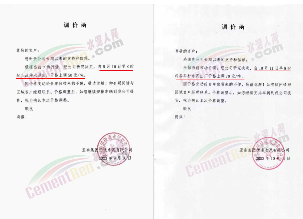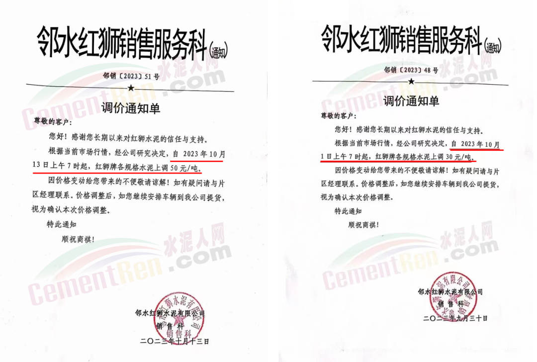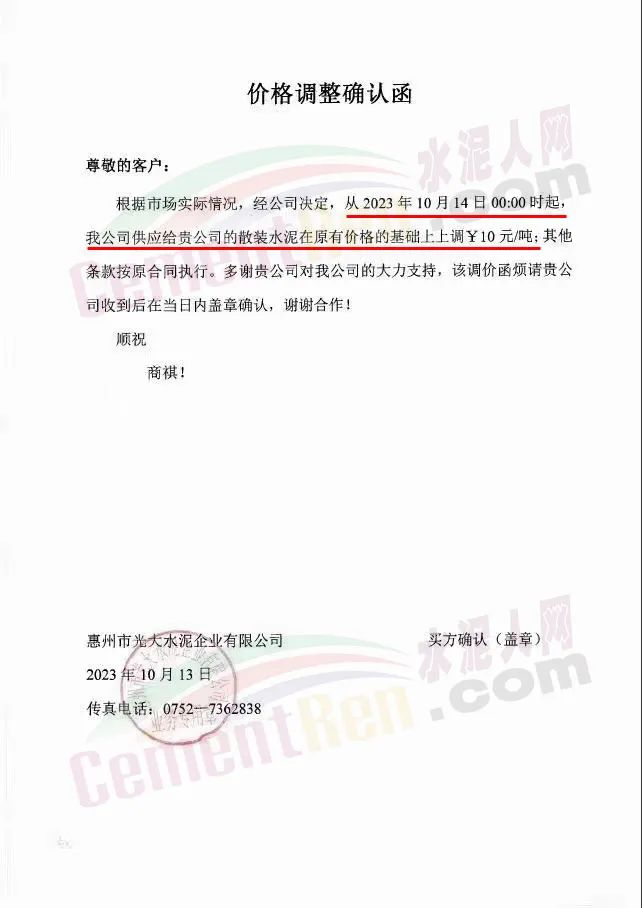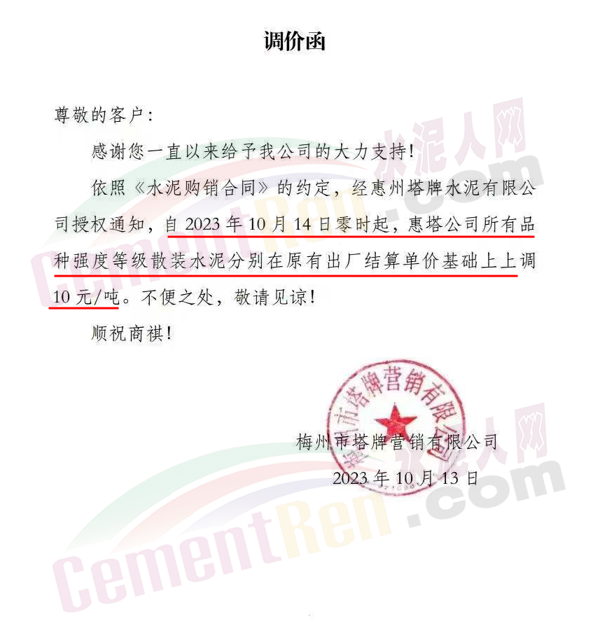 梅州市塔牌营销有限公司通知,经惠州塔牌水泥有限公司授权通知,自2023年10月14日零时起,惠塔公司所有品种强度等级散装水泥分别在原有出厂结算单价基础上上调10元/吨。