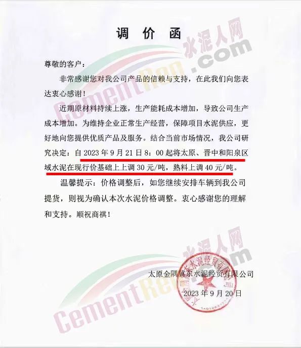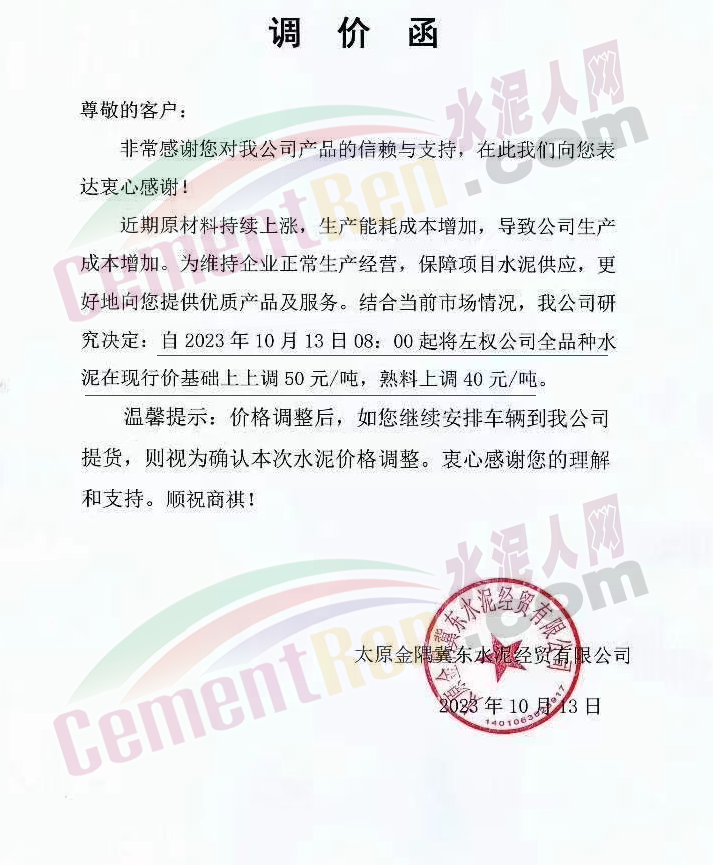 日前,山西太原金隅冀东水泥经贸有限公司通知称,近期原材料持续上涨,生产能耗成本增加,导致公司生产成本增加。为维持企业正常生产经营,结合当前市场情况,公司研究决定,自2023年10月13日08:00起将左权公司全品种水泥在现行价基础上上调50元/吨,熟料上调40元/吨。自12时起将阳泉、晋中太原区域PO425散装水泥在现行价基础上上调30元/吨,熟料上调40元/吨。