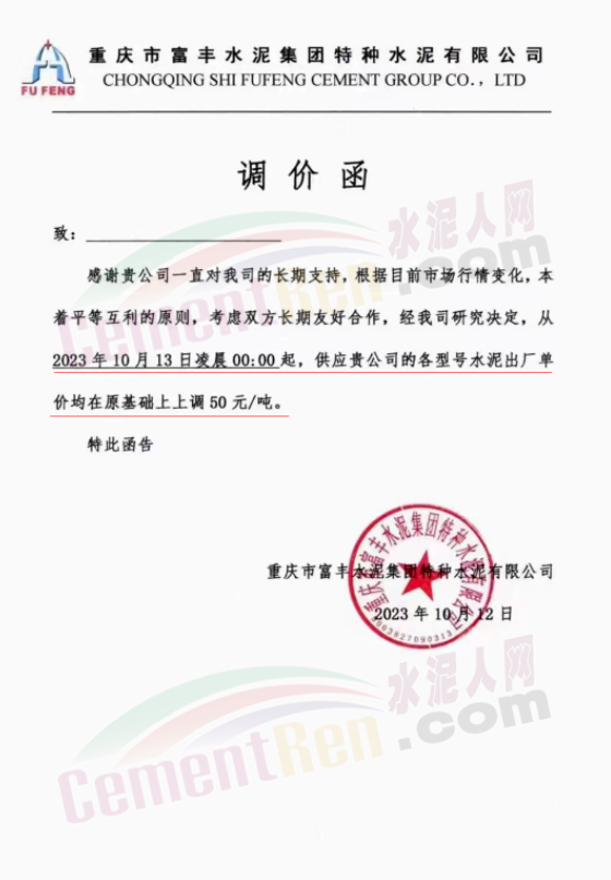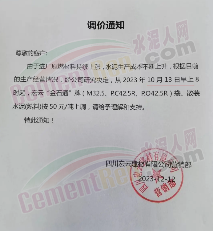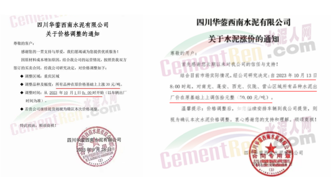 同日,川渝区域华新、西南、富丰、小南海等多家品牌水泥通知上调水泥报价50元/吨。