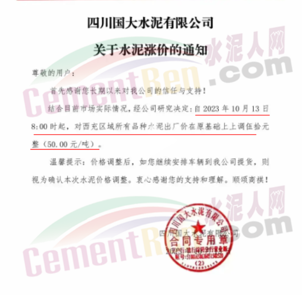 10月13日,广东多区域经销商收到通知,水泥价格将于14日起上调10元/吨。华润水泥投资有限公司通知,自10月14日0时起,公司珠三角(含惠州)及粤西各区域全品种散装水泥价格上调10元/吨。
