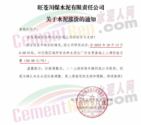 江苏区域经销商亦通知,根据市场分析,受煤炭涨价影响,水泥价格近期会有上涨可能。