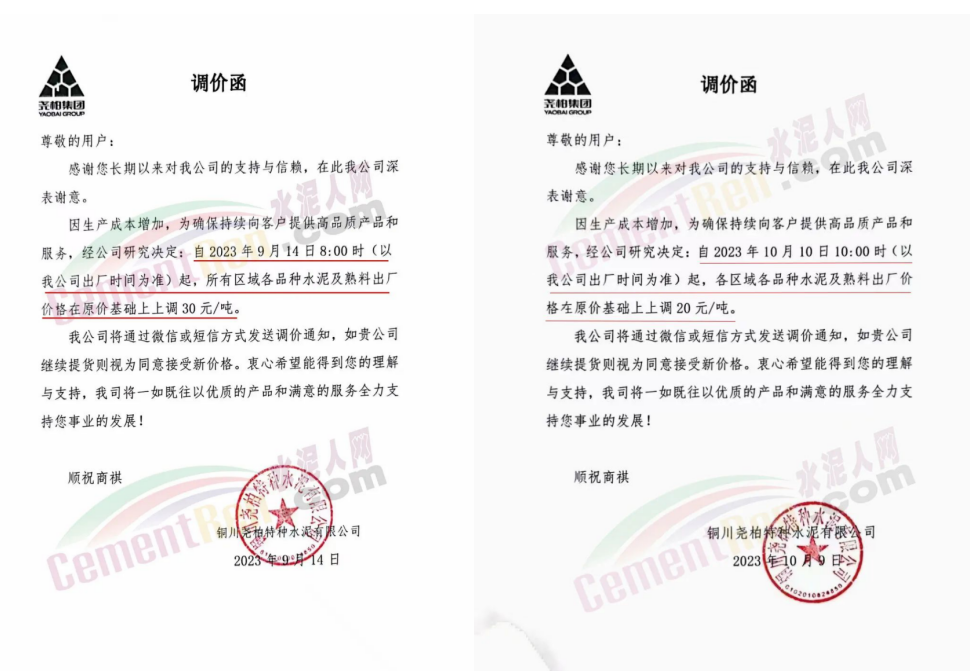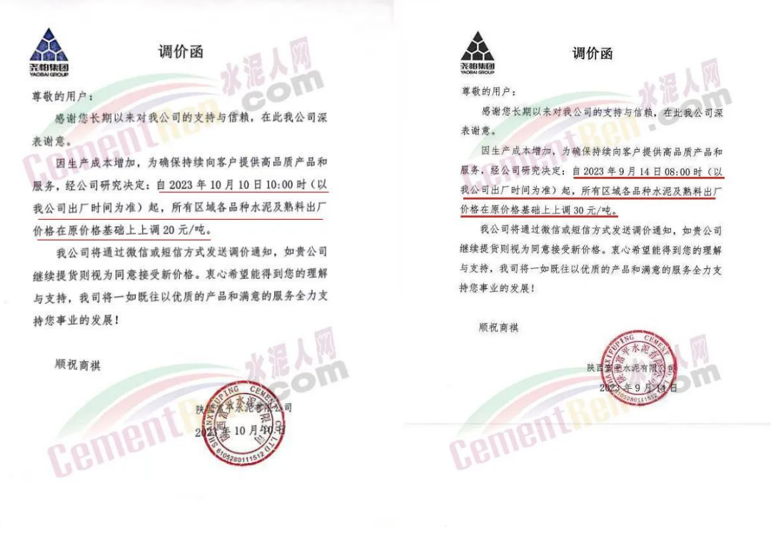 陕西关中区域主要品牌企业尧柏、冀东等分别于9月中旬和10月中旬两次上调报价,累计上调50元/吨。