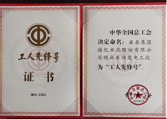 亚泰集团通化水泥股份有限公司烧成车间发电工段在中华全国总工会“2021年全国五一劳动奖和全国工人先锋号”评选活动中,被命名为“工人先锋号”。