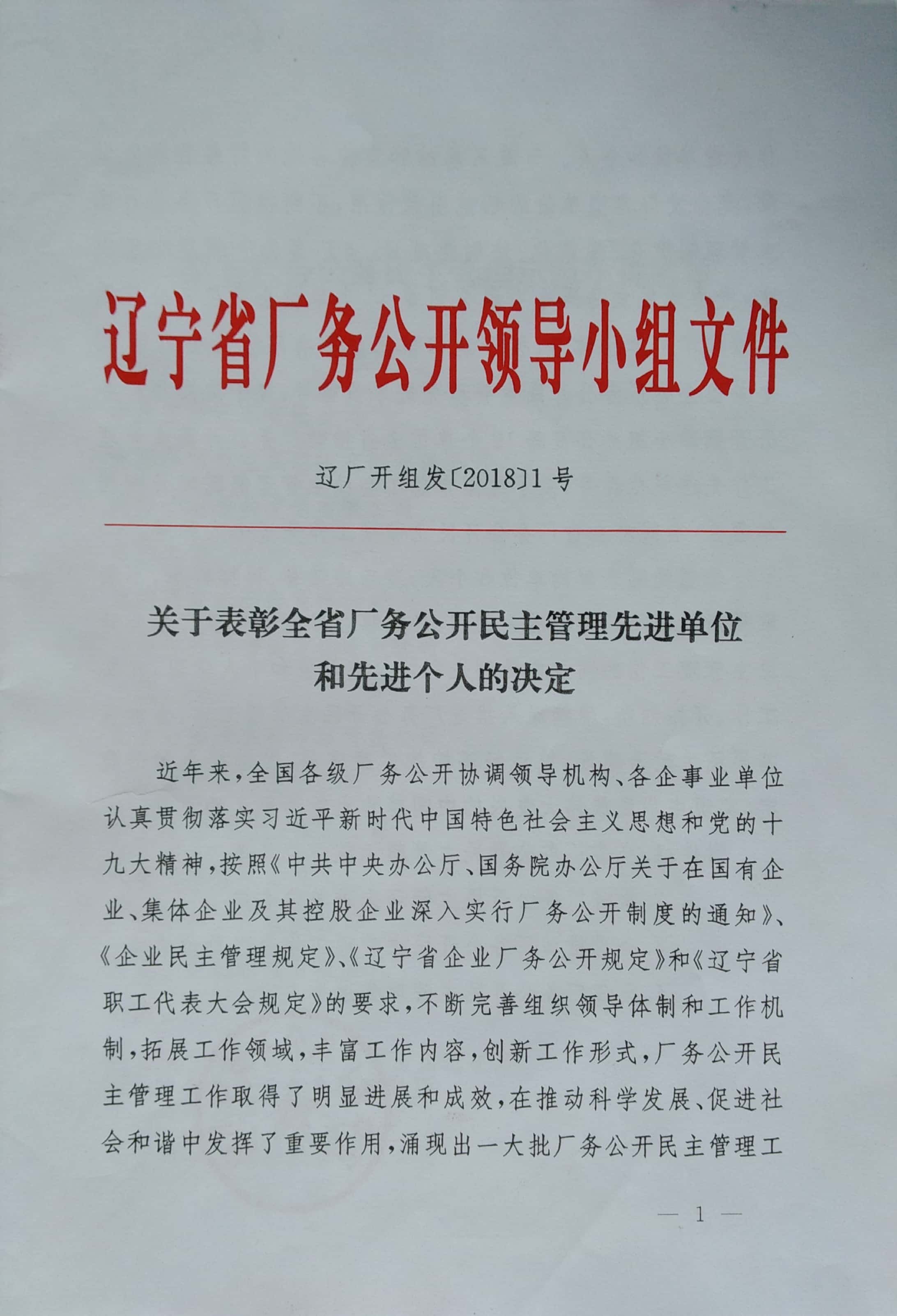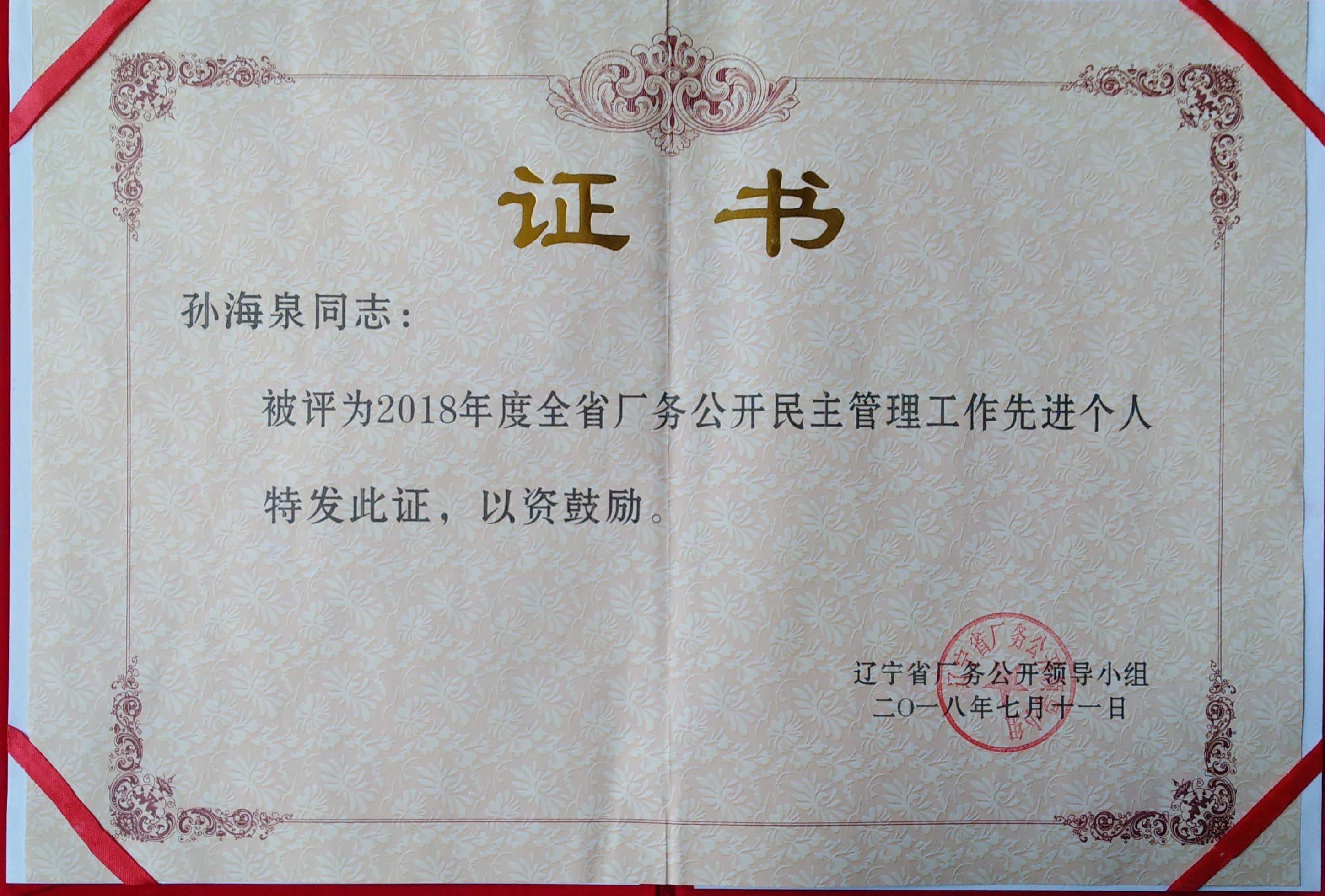 近日,辽宁省厂务公开领导小组下发文件(辽厂开组发【2018】1号),对全省厂务公开民主管理先进单位和先进个人予以表彰,授予45个单位全省厂务公开民主管理示范单位称号,92个单位全省厂务公开民主管理先进单位称号,19个单位全省推动厂务公开民主管理工作先进单位称号,90名同志全省厂务公开民主管理工作先进个人称号,我公司工会干事孙海泉同志被评为2018年度全省厂务公开民主管理工作先进个人。