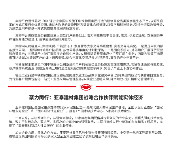 在做好内部数字化转型的同时,我们更坚信协同发展的力量。集团先后与中铁物贸集团、中交第一航务工程局、鞍钢建设集团等 20 多家大型企业集团缔结长期战略合作伙伴关系,在产业链各环节深度联动,实现优势互补。近年来,在与中铁物贸集团的合作中,以其旗下建筑业全品类数字化生态平台---集物平台为重点,借助其源头直采的优质资源、大数据智能风控及数智化管理能力,叠加亚泰集团的生产制造优势,共同为行业提供一站式供应链集成服务。从物贸在线的协同履约,到鲁班工业品的透明采购,双方共同协作,让产业链各环节高效联动、降本增效。