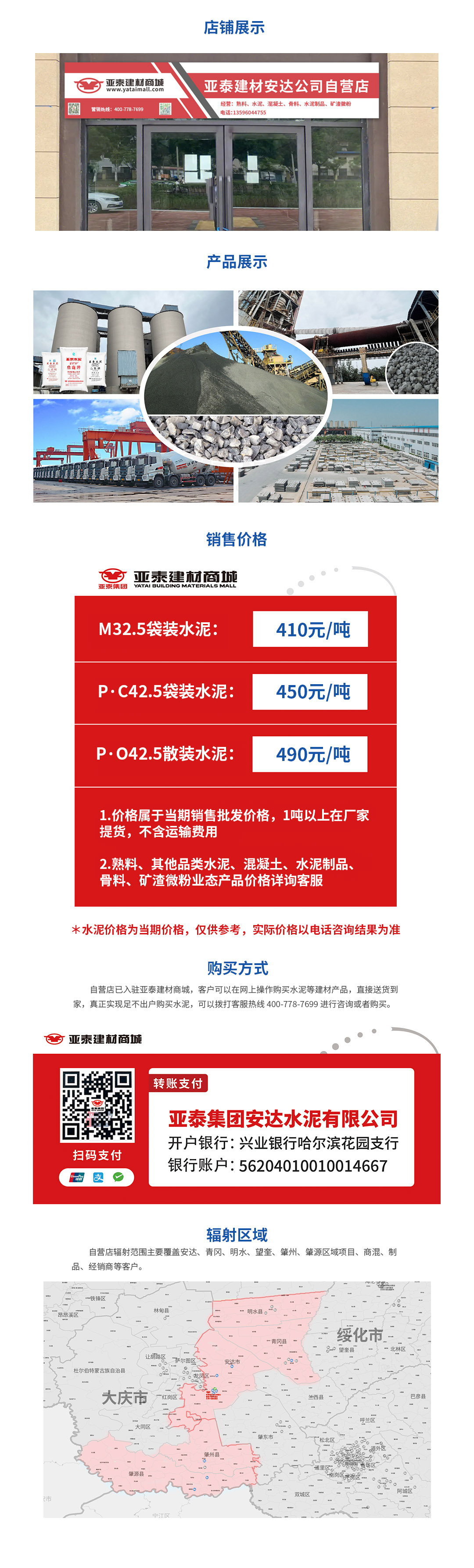在安达及周边区域的建设浪潮中,亚泰建材安达公司自营店 以 官方直营 身份亮相,聚焦 全等级袋装 / 散装水泥 核心品类,延伸熟料、混凝土等全链产品,辐射安达全境及青冈、明水、望奎、肇州、肇源等地,为基建与民生工程注入 “亚泰品质” 动能。