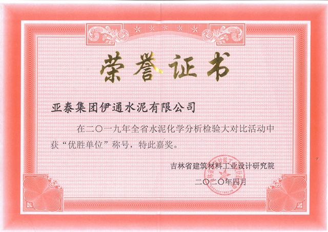 2020年4月亚泰集团伊通水泥有限公司在吉林省建筑材料工业设计研究院组织的2019年全省水泥品质、化学分析指标检验大对比活动中荣获“优胜单位”荣誉称号。