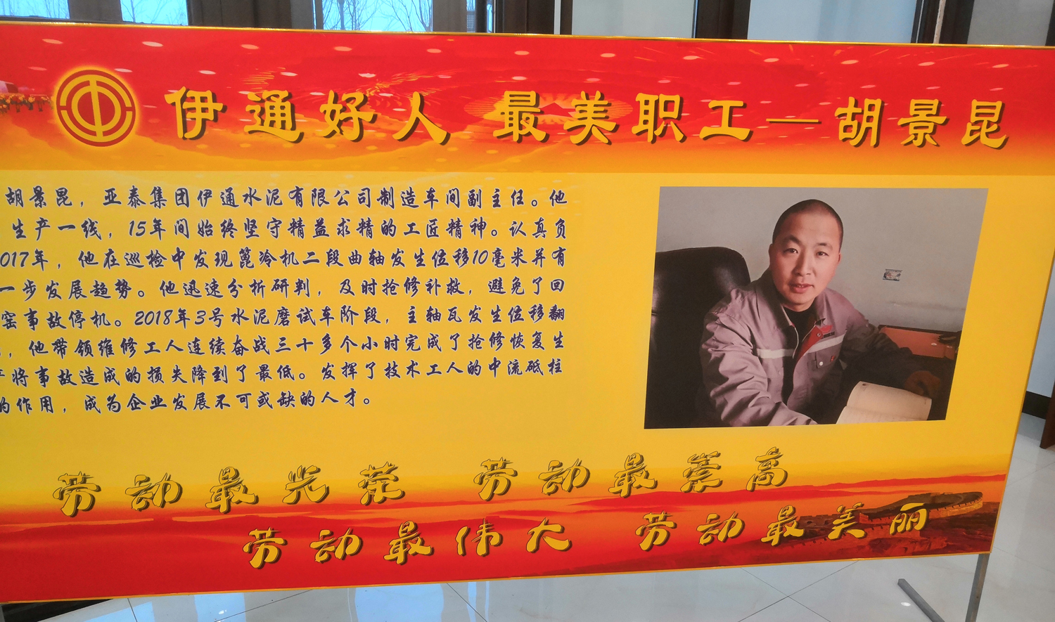 亚泰建材伊通公司胡景昆同志获“伊通好人,最美职工”荣誉称号