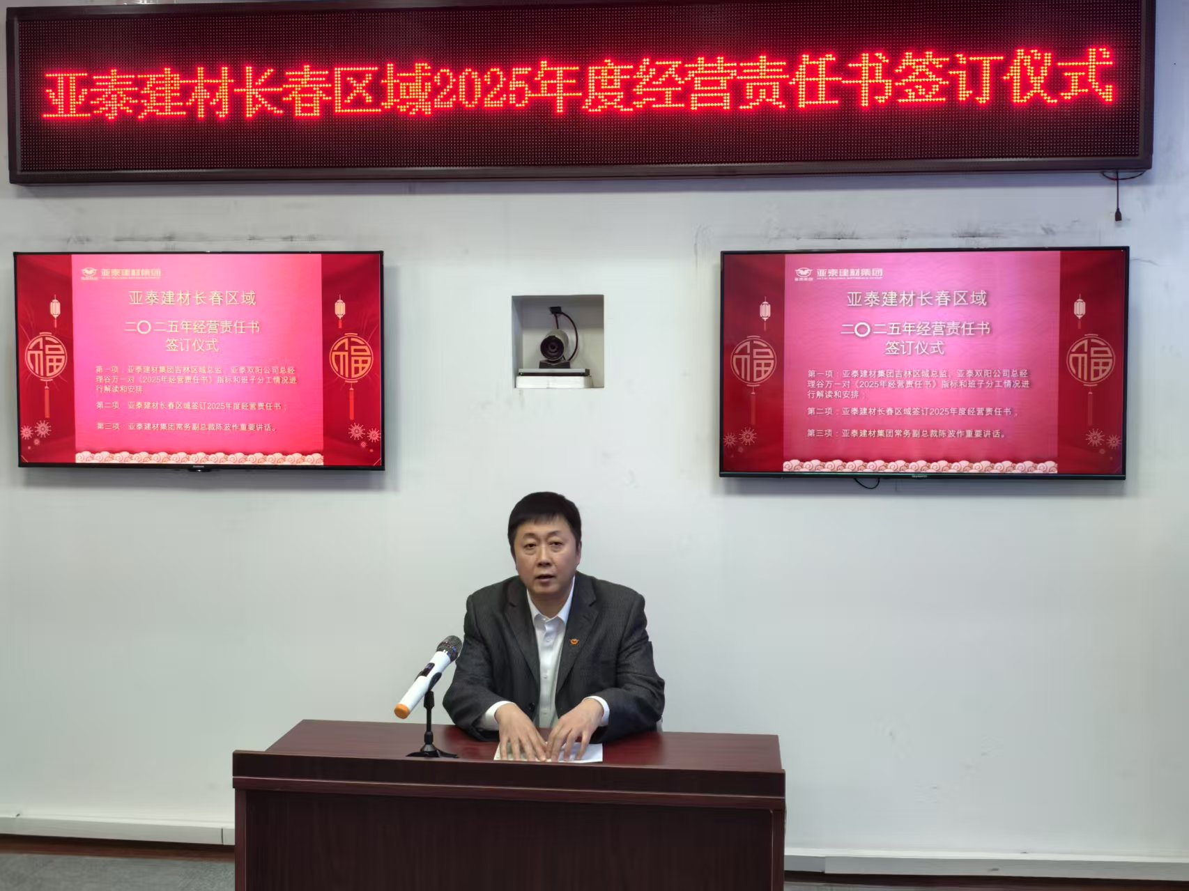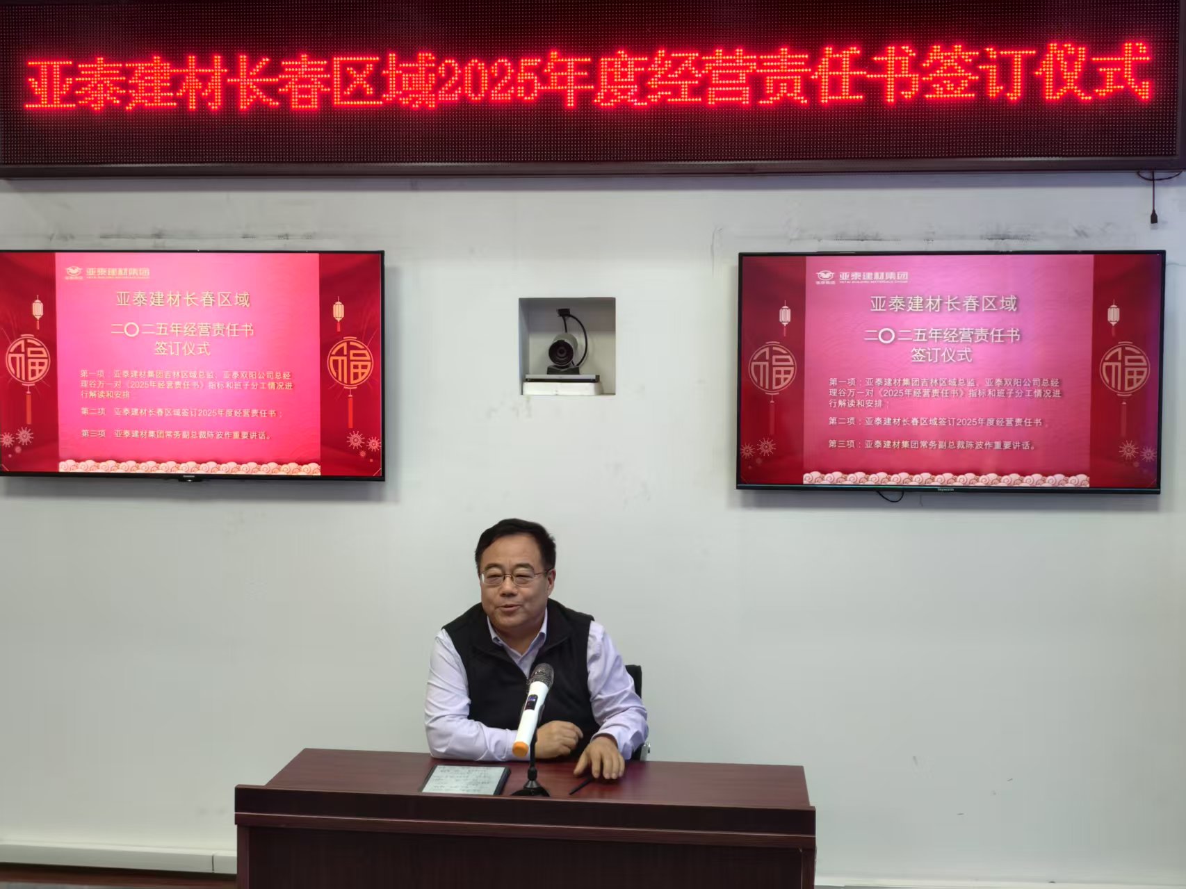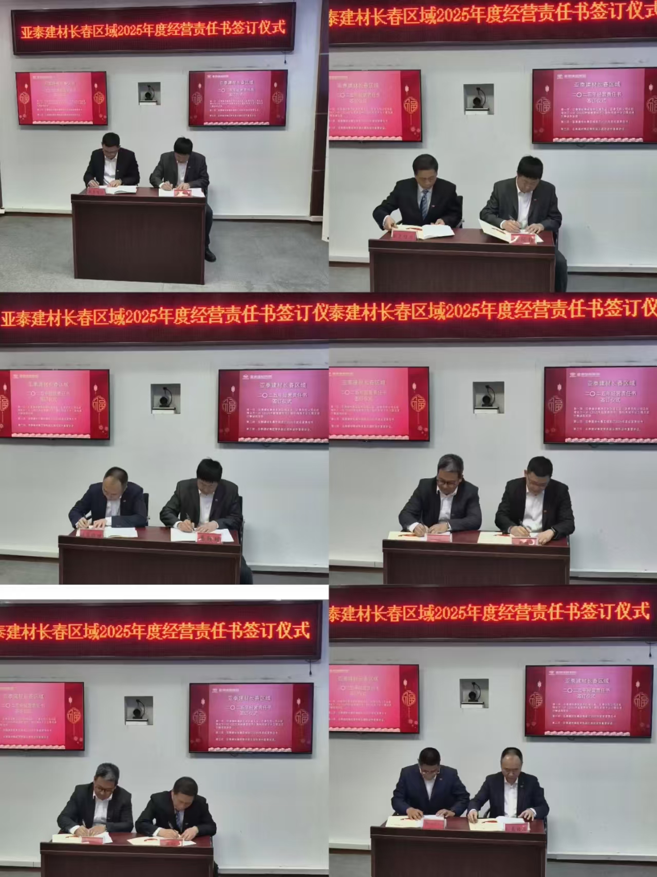 仪式第二项,谷总分别与亚泰建材伊通公司、亚泰建材鼎鹿公司、亚泰建材双阳公司签订了2025年经营责任书;双阳公司姜总与长春区域班子分工签订企业与部门经营责任书;鼎鹿公司董总按照长春区域班子分工与部门签订经营责任书;伊通公司孙总按照长春区域班子分工与部门签订经营责任书。