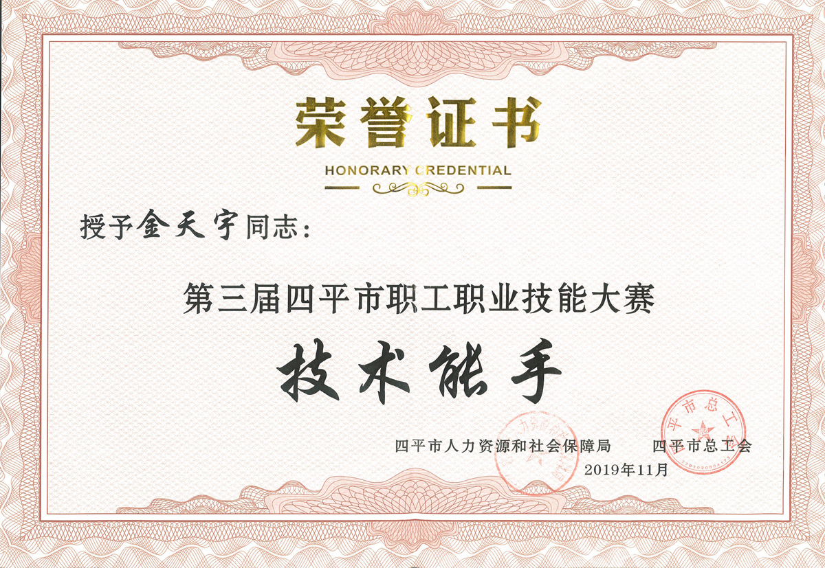 祝贺亚泰建材伊通公司制造车间电气工程师金天宇荣获“四平市技术能手”称号