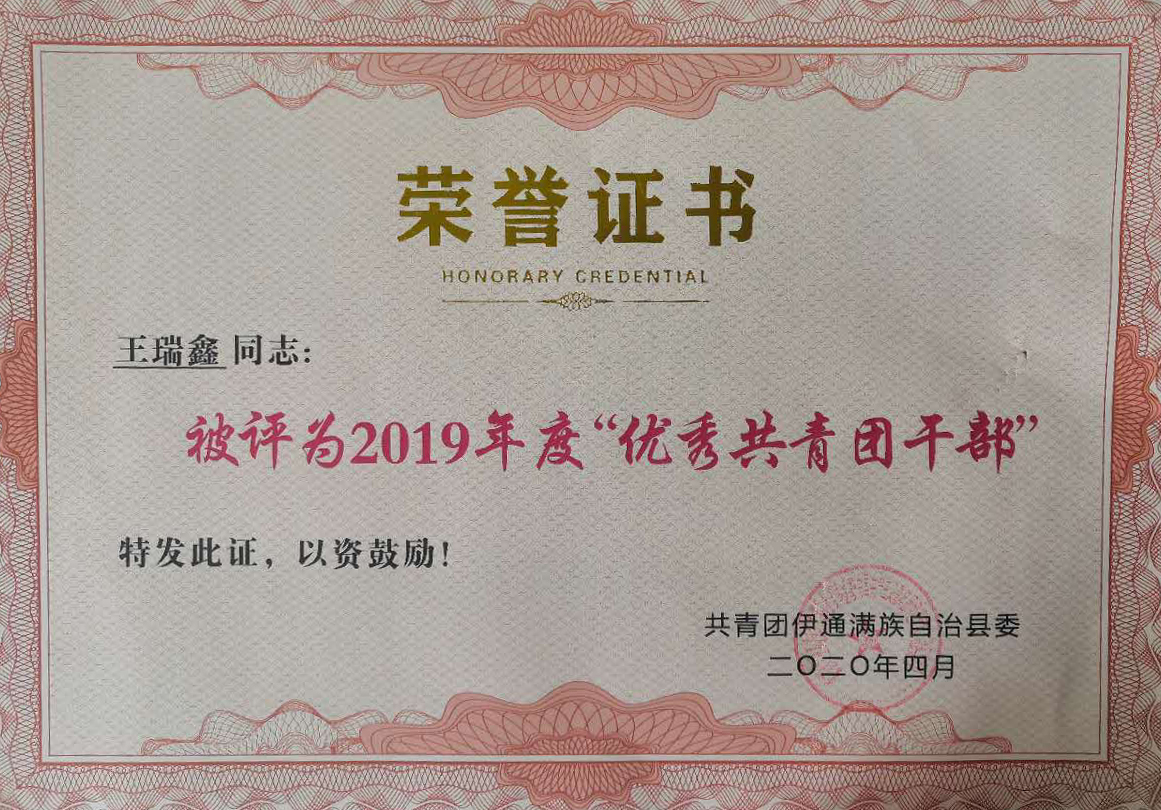 亚泰建材伊通公司综合部王瑞鑫同志被共青团伊通满族自治县委评为“2019年度优秀共青团干部”称号。