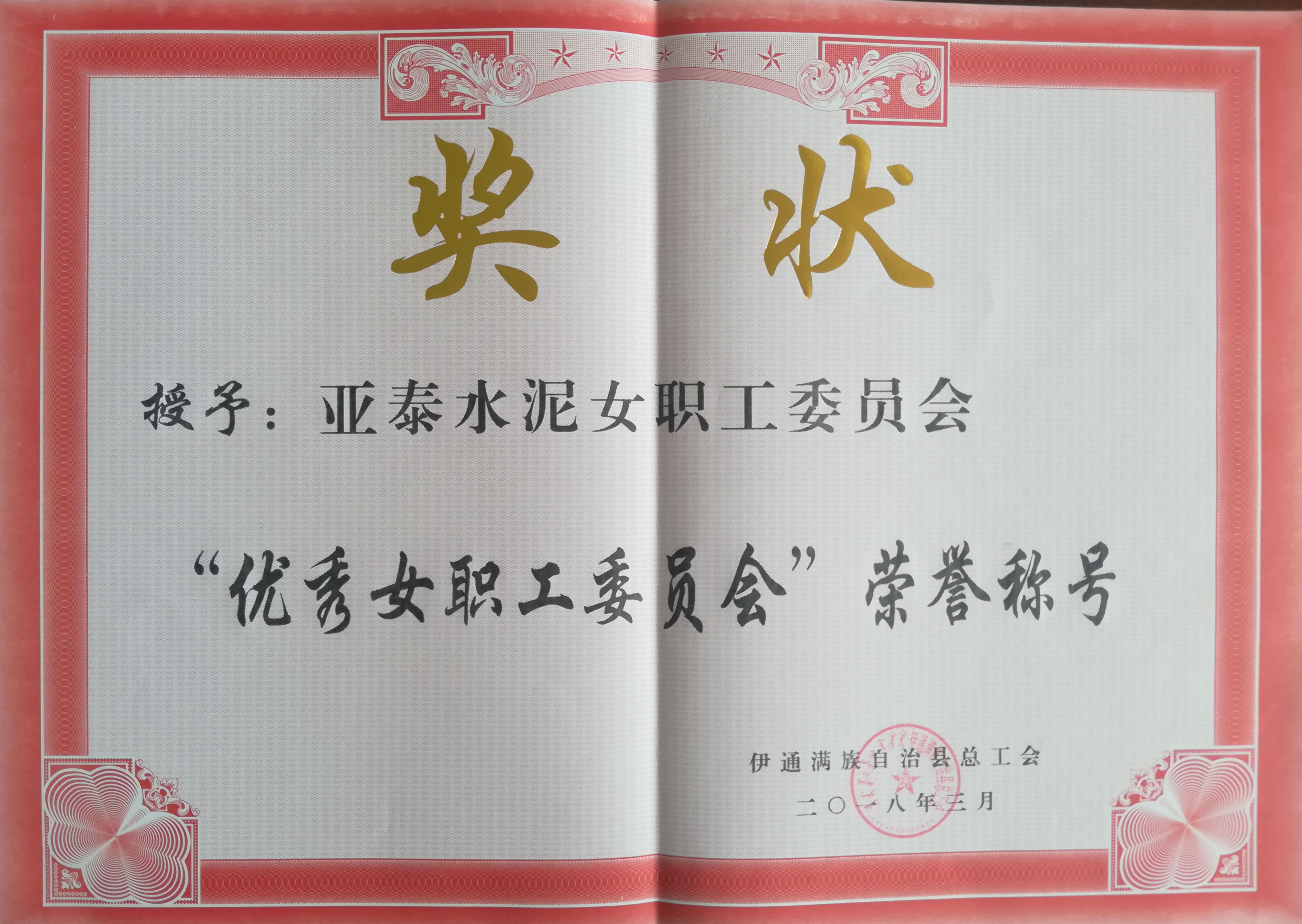 伊通满族自治县总工会为表彰过去一年中成绩突出,维护合法权益和特殊突出贡献企业,亚泰集团伊通水泥有限公司荣获“优秀女职工委员会”称号。
