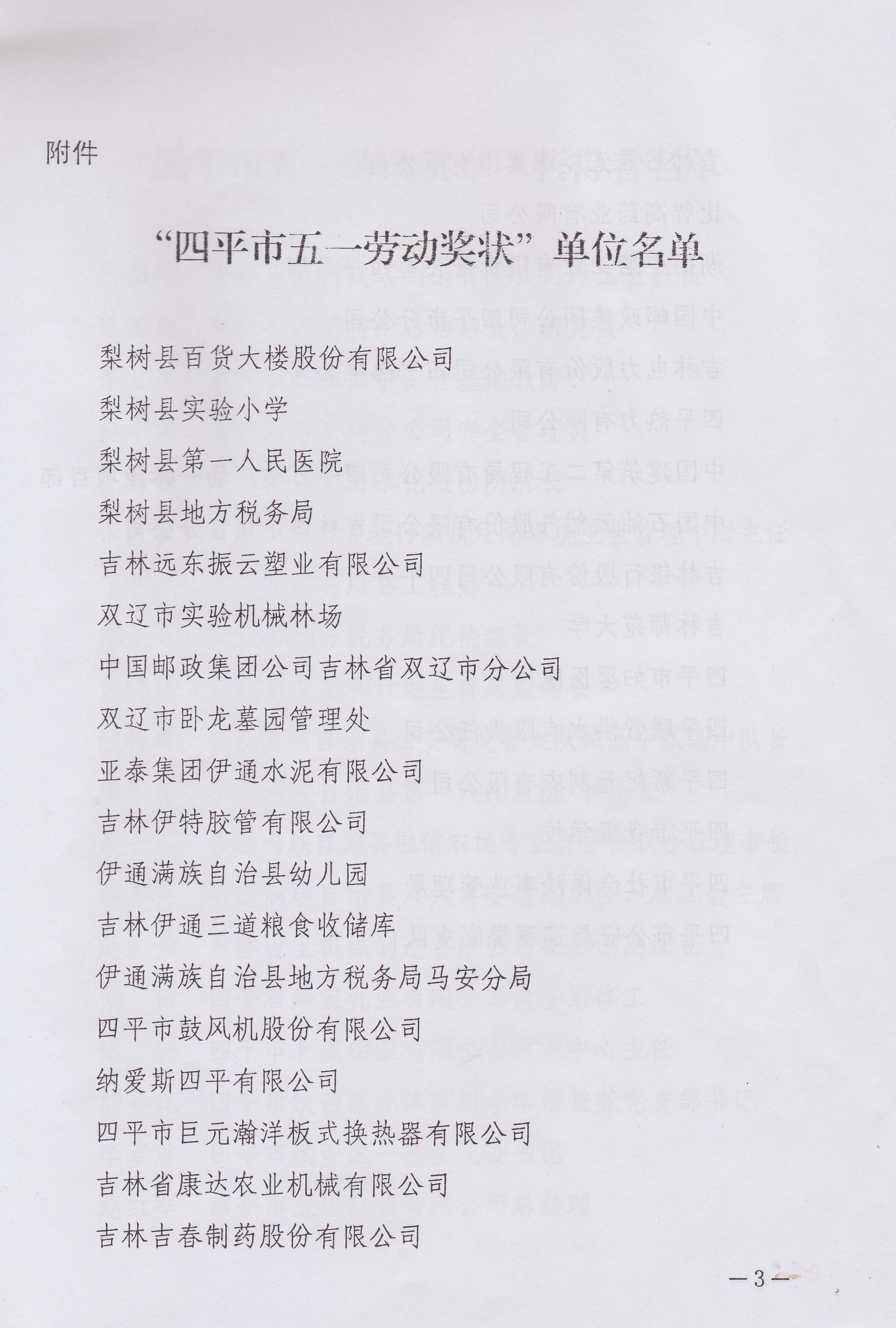 亚泰建材伊通公司荣获“四平市五一劳动奖状”单位称号
