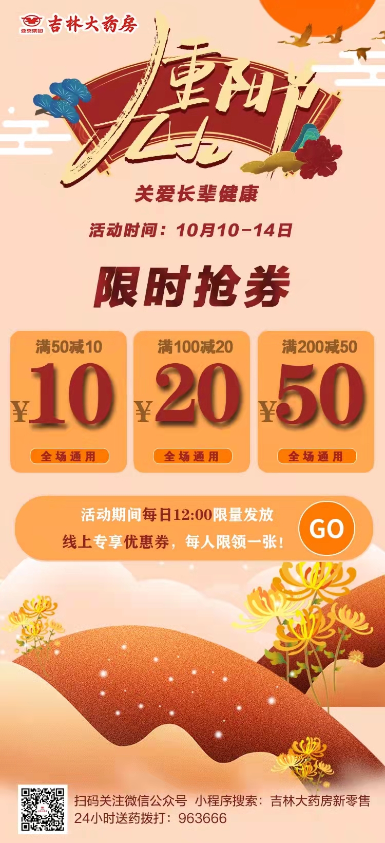 吉林大药房新零售线上限时抢券——10月10日-14日每日12:00限量发放!