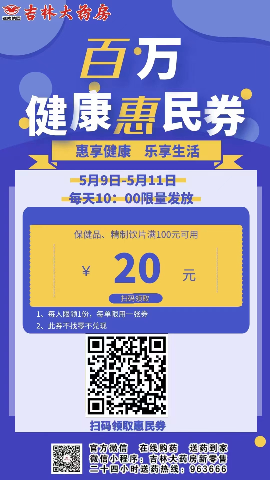 吉林大药房送您20元健康惠民券,5月9日-13日购买保健品、精制饮片满100元可用!