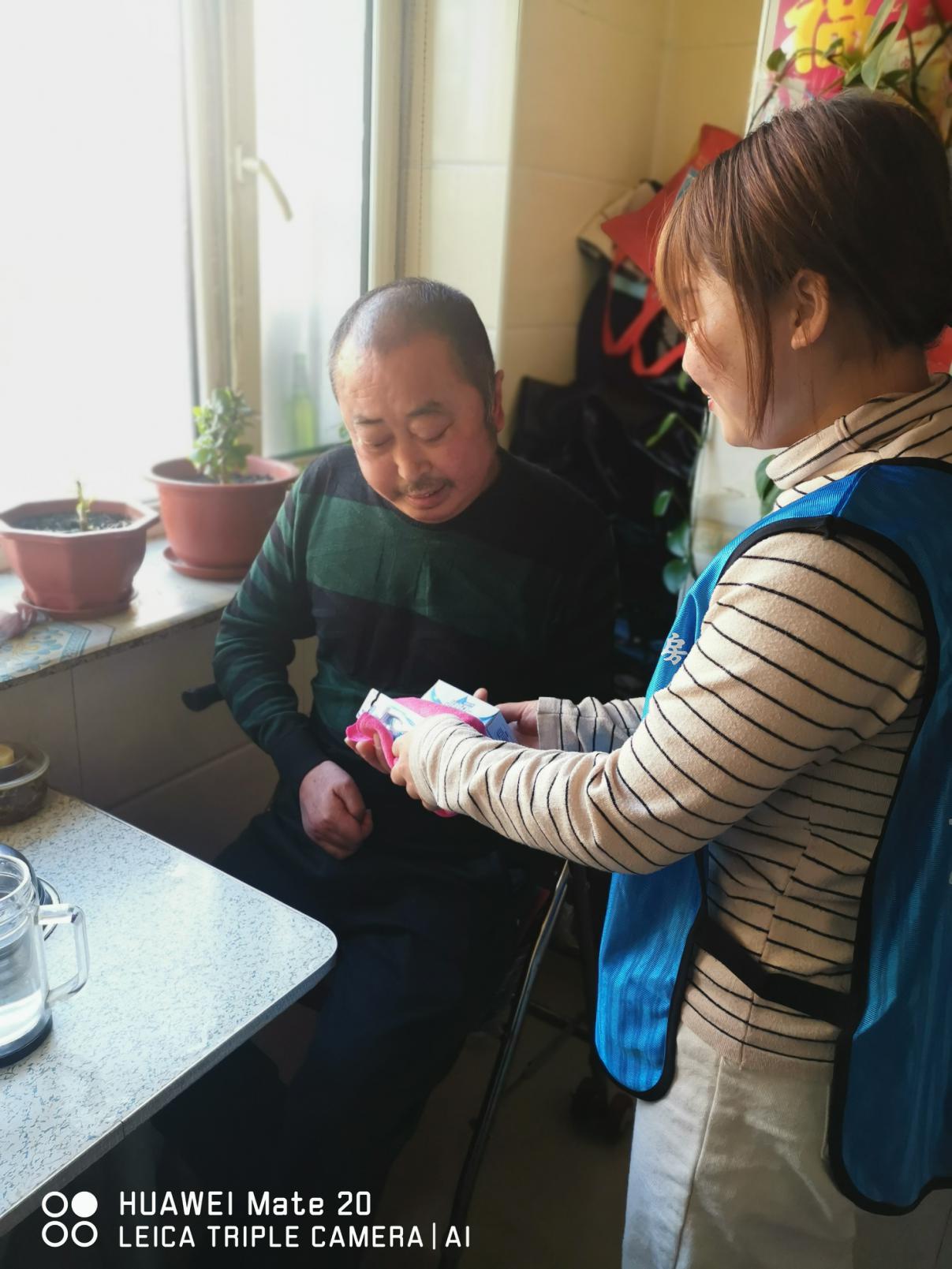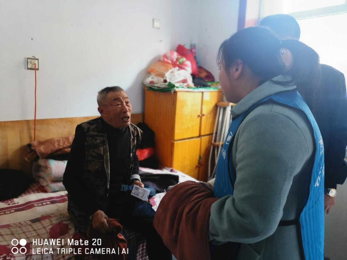 上图:志愿者咨询老人身体情况并送上生活常备品