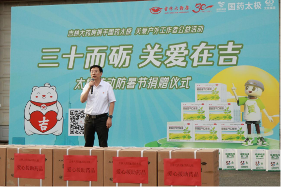 国药太极集团大区总监李大江、吉林大药房副总经理翟勋为劳动者代表发放物资