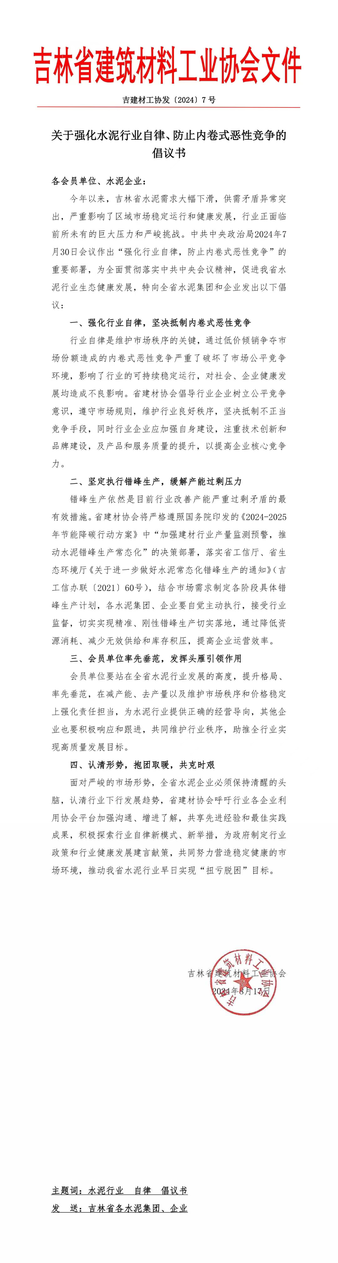 8月17日,吉林省建筑材料工业协会发布《关于强化水泥行业自律、防止内卷式恶性竞争的倡议书》: