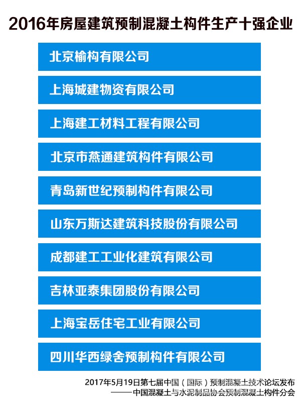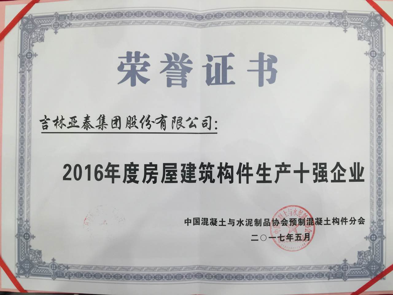 中国混凝土与水泥制品协会预制混凝土构件分会通过对会员单位广泛调查,并以2016年会员单位生产经营各项调研数据为依据,综合考虑生产规模、产品类型、综合管理、社会综合评价等因素,评选出“2016年房屋建筑预制混凝土构件生产十强企业”。吉林亚泰(集团)股份有限公司作为东北地区预制构件生产行业的领军者实至名归荣获此殊荣。徐永模执行会长和蒋勤俭理事长为“2016年房屋建筑预制混凝土构件生产十强企业”颁发了证书。