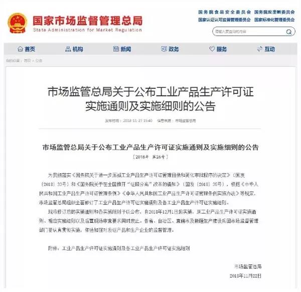 现将修订后的实施通则和各实施细则予以公布,自2018年12月1日起实施,原工业产品生产许可证实施通则、相应实施细则以及后置现场审查要求同时废止。各省、自治区、直辖市及新疆生产建设兵团市场监督管理部门要认真贯彻实施,依法加强对发证产品和生产企业的监督管理。