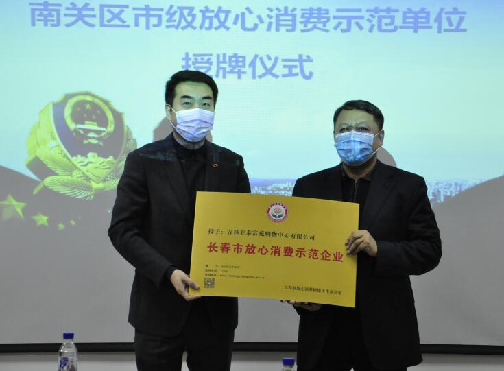 长春市市场监督管理局副局长于艇向亚泰富苑总经理姜钊颁发长春市放心消费示范企业牌匾
