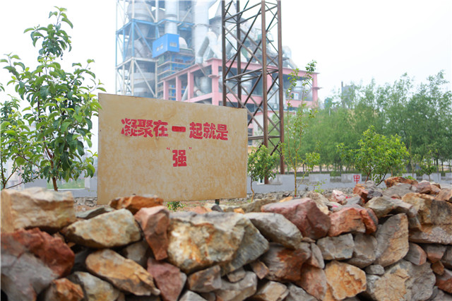 铁岭公司有一句口号:“凝聚在一起就是‘强’”。这句口号里有一段感人的故事:位于厂区北侧山脚下的三线熟料工程竣工后,残存许多碎石、碎渣,但不便于大型清扫车辆作业,员工们就用手推车、用麻袋将一袋袋石头堆放在一起。爱动脑筋的石阳带着工段员工,把碎石在班前会议室旁边堆砌成型,做成了一座景观墙,并写上了八个大字---“凝聚在一起就是‘强’”,充分展现了车间员工团结实干的拼搏精神。另外,他自费购买花籽树苗,在工余时间栽花种草,还利用各种废弃物制作花盆、垃圾桶等,用勤劳和智慧美化厂区环境,为厂区的整洁和美丽献出了一份力。