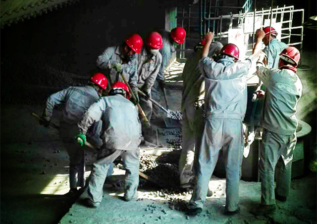 镜头二:由于制成一车间42.5水泥库存降低,为保证正常销售付货,二线上料工段长杨和新带领“突击队”来到制一车间支援,协助补填研磨体,为水泥磨提前开磨争取了宝贵的时间。