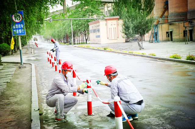 镜头六:因时间较长,厂区主路两侧人车分离线颜色变淡,员工利用生产空闲时间进行清洁油漆,美化厂区环境,增强安全效果。