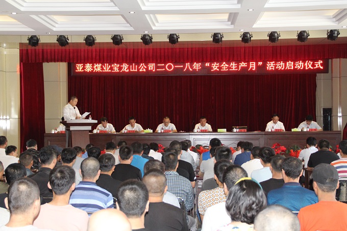 为贯彻落实国务院安委会办公室《关于开展2018年全国“安全生产月”和“安全生产万里行”活动的通知》、《亚泰集团2018年“安全生产月”活动方案》,6月4日上午,宝龙山公司召开“安全生产月”活动启动仪式,公司高管、中管、区(队)长及员工代表共计157人参加,启动仪式由总工程师赵臣主持。