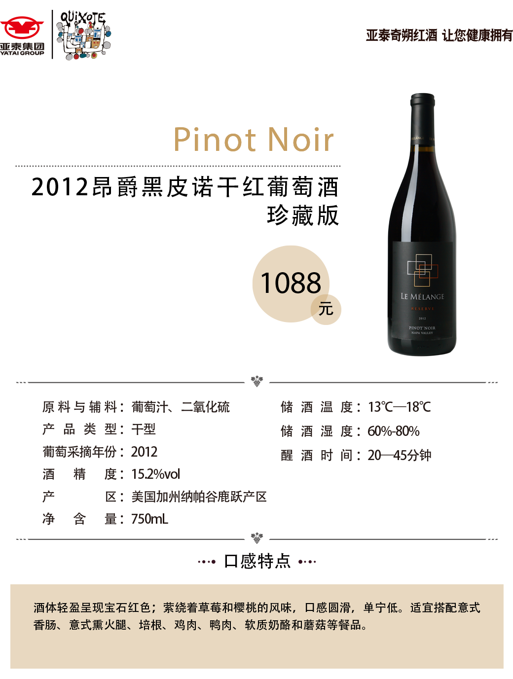 2012昂爵黑皮诺干红葡萄酒珍藏版