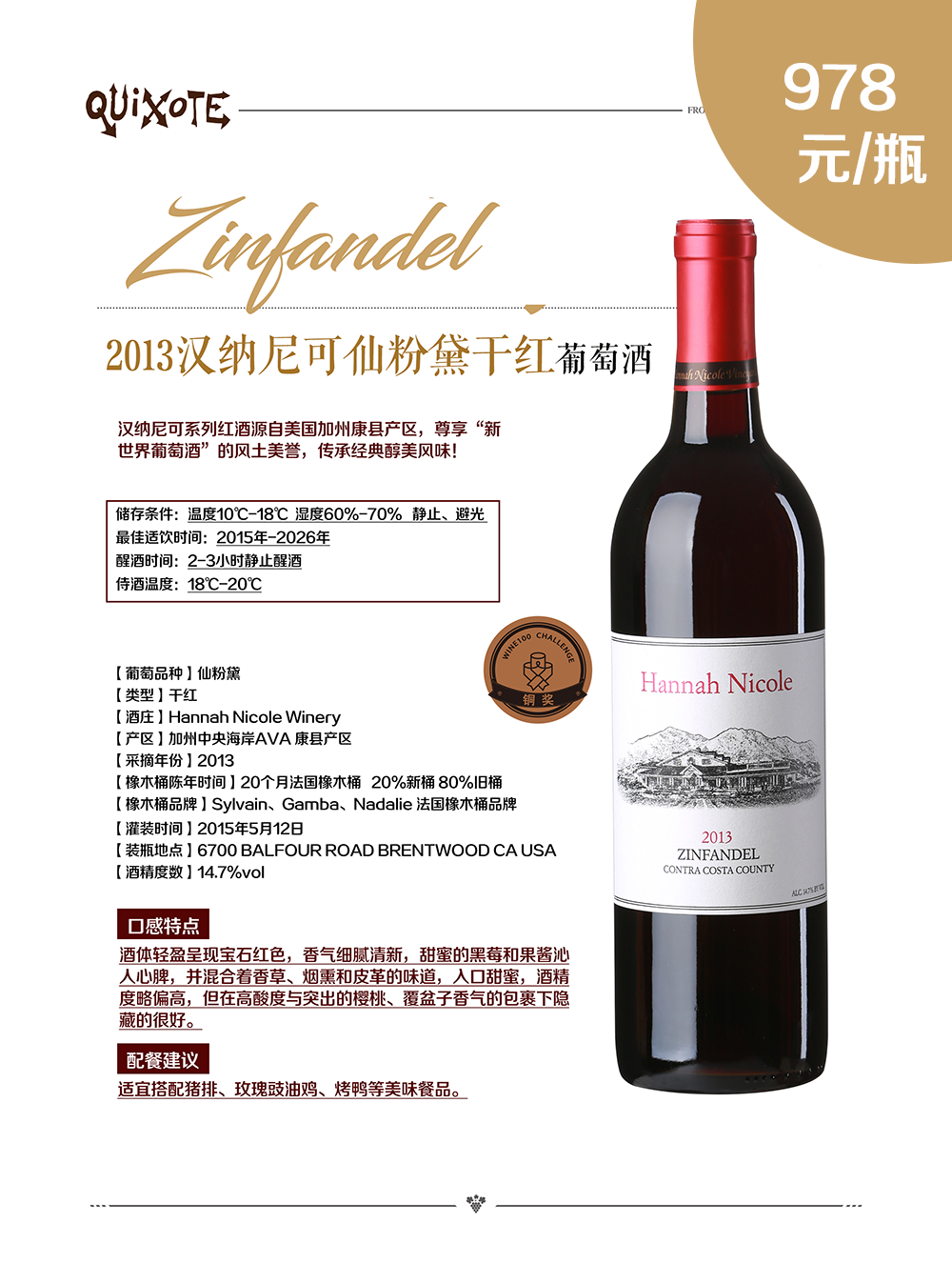 2013汉纳尼可仙粉黛干红葡萄酒