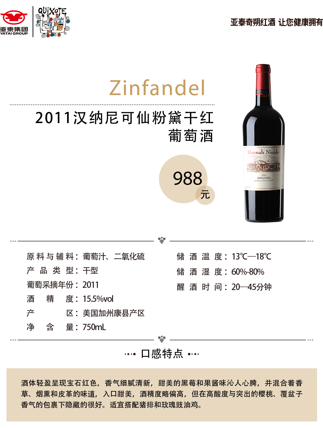 2011汉纳尼可仙粉黛干红葡萄酒