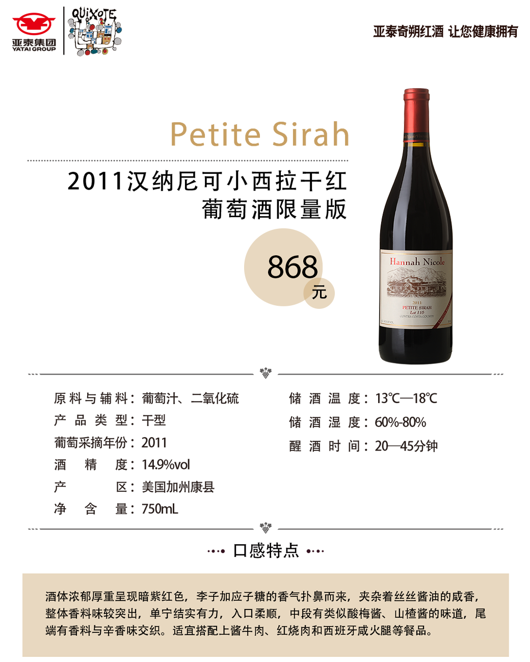 2011汉纳尼可小西拉干红葡萄酒限量版