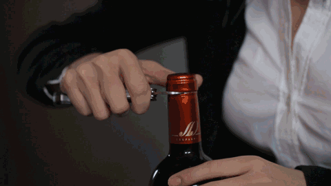 ①瞄准软木塞的中心,把开瓶器的螺旋钻头插下去。这一点是顺利开瓶的关键。把螺旋钻头插下去之后,开始转动开瓶器。转动时,不要单单用手腕发力,要手臂、手腕和手掌一起均匀发力。