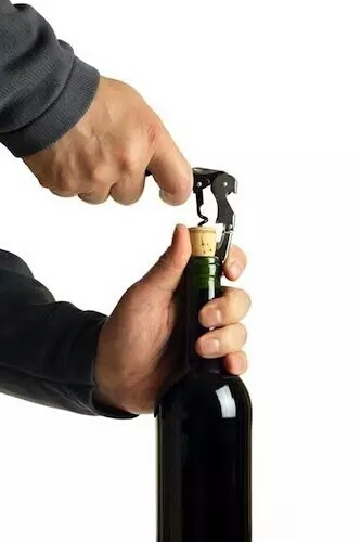 ③如果软木塞破碎了,把酒瓶放在稳定的平面上,把螺旋钻头对准软木塞的中心插下去,但不要转动它,要用另一只手慢慢转动酒瓶。