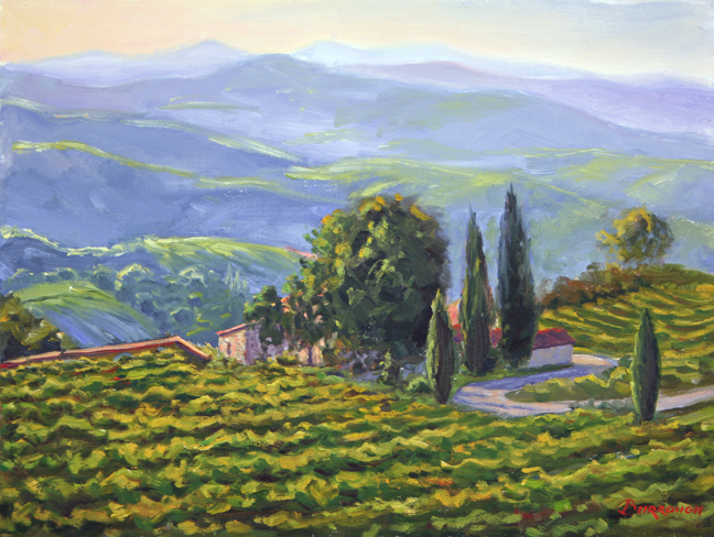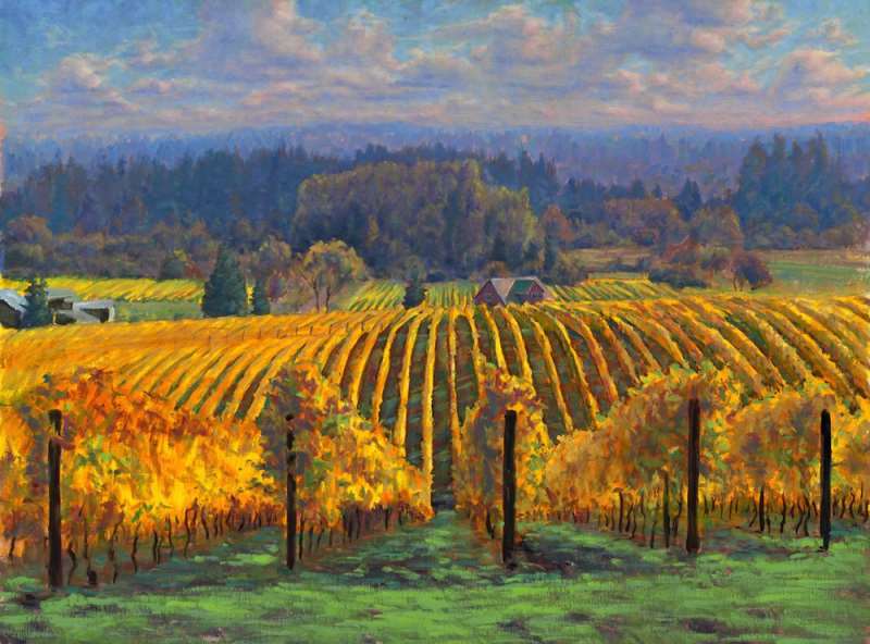 在俄勒冈州连绵起伏的山坡间,葡萄园已进入了收获的季节,山坡尽头郁郁葱葱的树林似乎也染上了喜悦的颜色,几间小酒庄穿插其中,岁月静好。