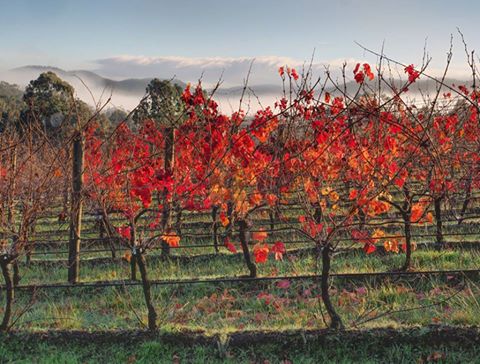 深秋的雅拉谷产区(Yarra Valley),葡萄采摘早已完成,枝头上只余一些红胜火的葡萄叶默默绽放,光秃的枝桠肆意而孤独的伸展着,似乎在缅怀曾经的伙伴。