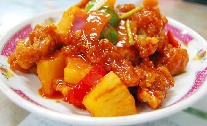1、将里脊肉用水洗净,切成1.5cm左右的方块;将菠萝去皮洗净,同样切成1.5cm大小的方块。