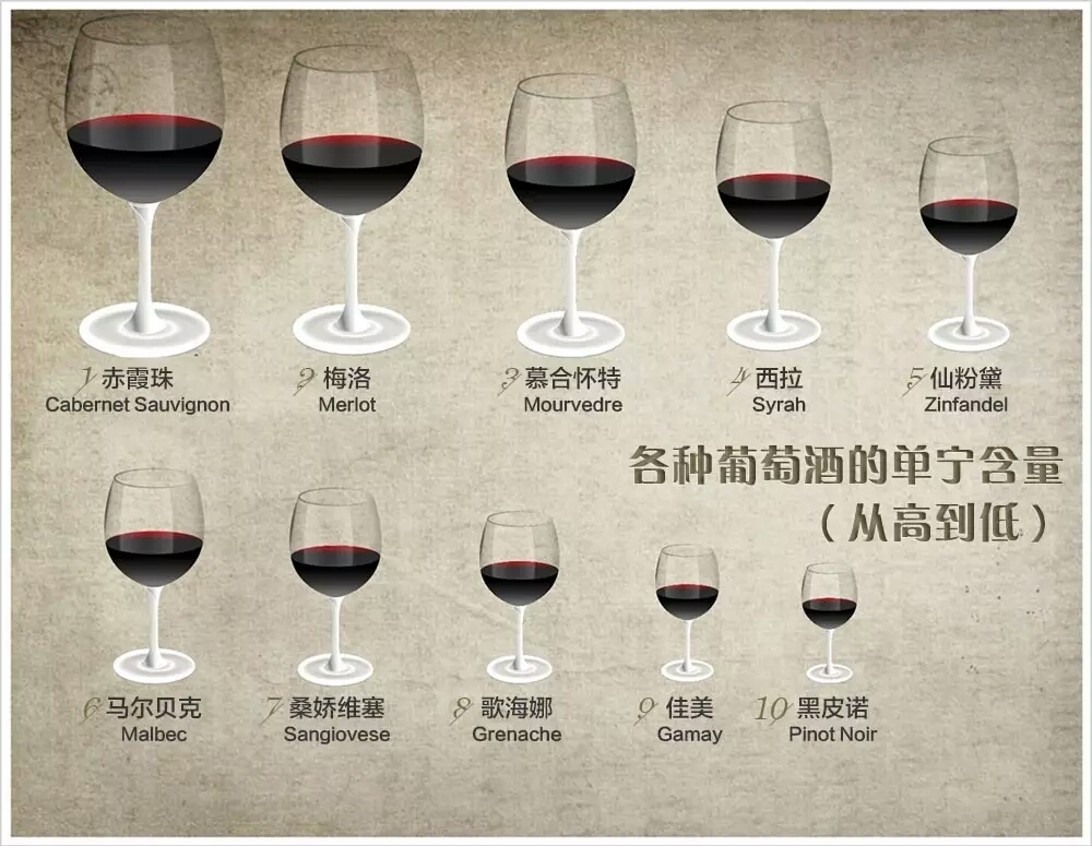 下面的图片清晰地展示了各种葡萄酒的单宁含量高低。