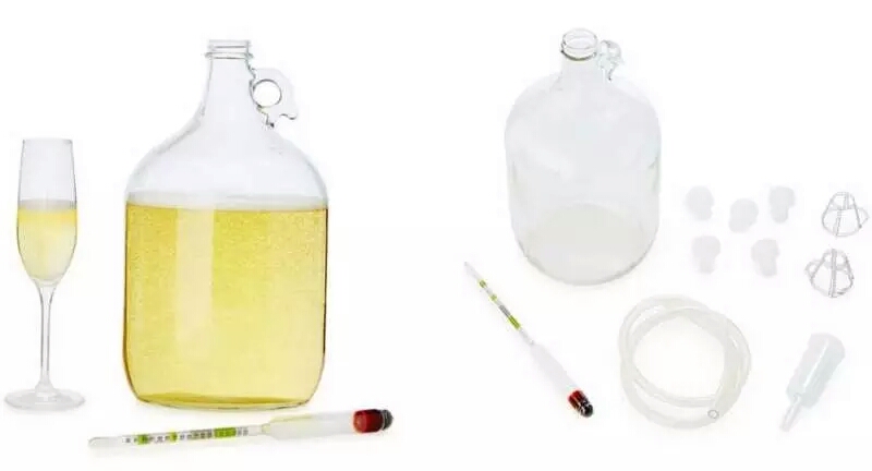 这一套设备包含自酿一罐起泡酒所需的全部工具,包括霞多丽(Chardonnay)葡萄汁、起泡酒酵母、玻璃发酵罐、浮秤、虹吸管(用于去除瓶底沉淀)、软管卡、清洁剂、气闸、瓶塞等等,非常齐全,也非常难用。如果不看说明书,相信这罐甜美的葡萄汁最后只能变成醋。