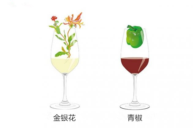 “金银花”也可用来描述经过橡木桶陈酿的霞多丽(Chardonnay)葡萄酒,这酒通常还会带有坚果和花朵等的香气。